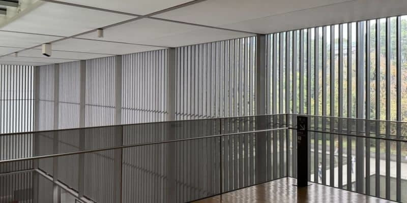 そして、抽象性を保ちながら、ある種の日本的空間に接近するための試みとして、建物へのアプローチを変化させ、正面外観の構成の非対称性を見せ、格子の縦線を際立たせています。