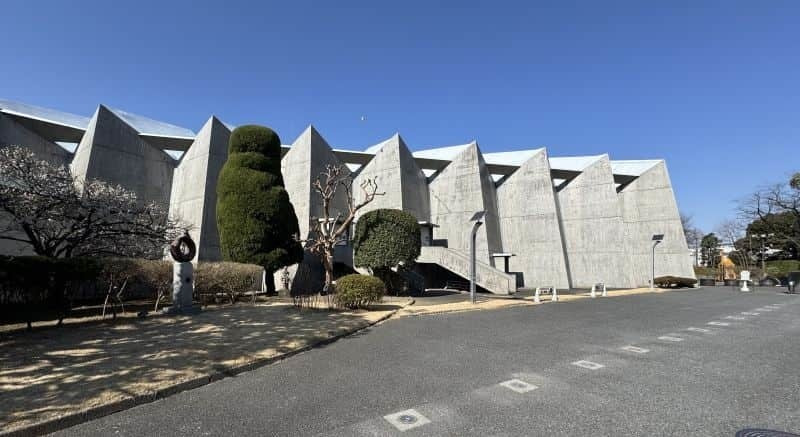 折板構造という折り紙のようにコンクリートの板を折り曲げたような柱や梁ではなく、屏風のような構造が特色です。全体を五角形で包み込む極めて意欲的な造形となっています。